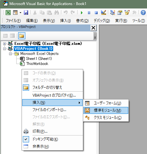 この下の空欄の部分で右クリック→挿入→標準モジュール