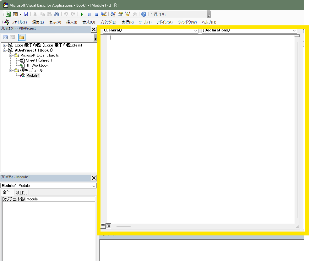 この黄色で囲まれている部分が標準モジュールの「Module1」のプログラムを書く場所です。