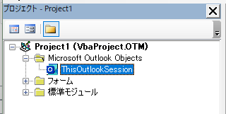 プロジェクト内のThisOutlookSessionを開いてコードを書く場所を準備します。